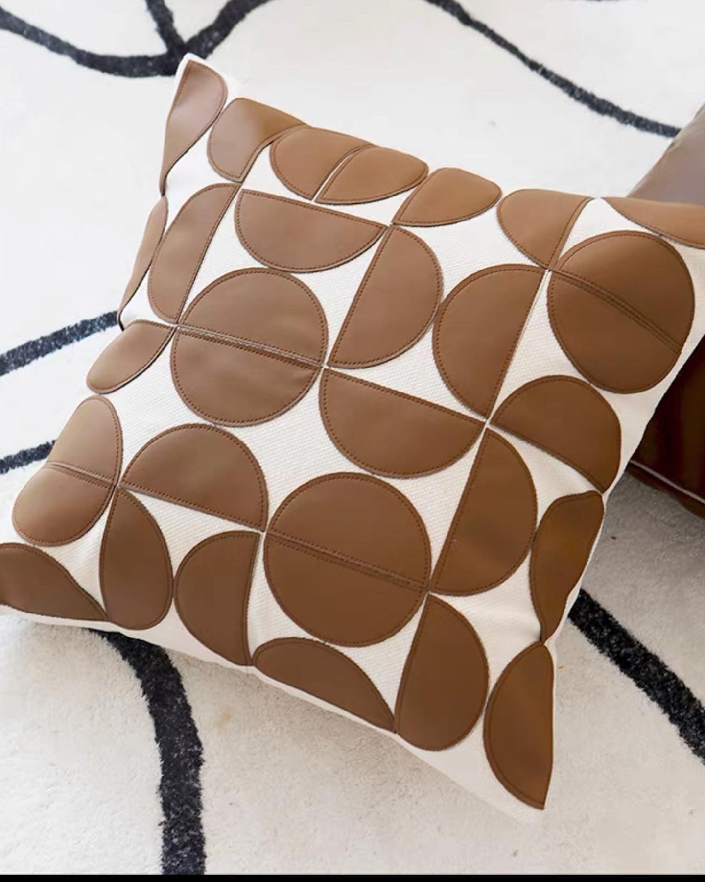 Crafted from faux leather, this series of semi circle on linen material exude a modern, minimalist yet luxurious feel. The leather details add a touch of texture with high end quality! Superb quality and craftsmanship!